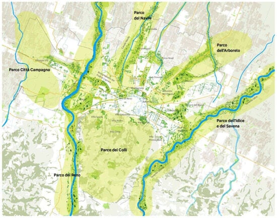 The Impronta Verde project of the city of Bologna. Blue lines represent watercourses, and green areas represent ecologic corridors. Source: Bologna Municipality.