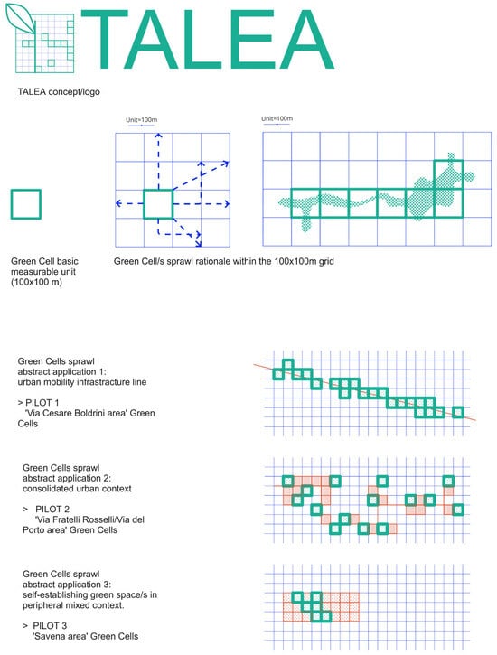 This paper deals with the description of the objectives, the methodology, and the principal tools of the innovative solution developed by a research–action project funded by the second EUI-IA, selected through the call for the proposals ’Greening Cities’, opened in the end of May 2023. The project is “TALEA—Green cells leading the Green transition” (EUI02-064), which started in December 2024 and will end in May 2028, with a total duration of 48 months (https://www.urban-initiative.eu/ia-cities/bologna/home, accessed on 15 January 2025). The TALEA project coordinator is the municipality of the city of Bologna (Italy) and the Bologna University is the scientific partner (leading structure: DA—Department of Architecture; junior structures: DISTAL—Department of Agricultural and Food Sciences; DISI—Department of Computer Science and Engineering; DIFA—Department of Physics and Astronomy). The project is the result of the work of the whole consortium of partners; the authors of this paper are members of the TRACE research team of the DA of the Bologna University (for the list of the partners, see the Acknowledgments, and for the DA researchers of the TRACE team, see the website https://da.unibo.it/it/ricerca/progetti-di-ricerca/progetti-in-ambito-internazionale/talea, accessed on 15 January 2025).