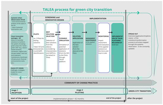 As a project funded by the EUI-IA Greening Cities initiative, TALEA’s overall ambition is to promote the dissemination of tested urban innovations throughout the EU, taking the risk of turning a research–action methodology and the related integrated solution into pilot projects that can be tested in real urban settings. This results-oriented approach is conceived to ensure that the replication and transfer process contributes to the objectives of the EUI-IA initiative, fostering tangible and measurable improvements in urban sustainability and climate resilience across Europe. Tangible results are required in all the fields of application of TALEA innovations. Examples of the multidisciplinary results indicators that have to be meet by the projects include the following: the improvement in the physiological equivalent temperature in the three areas before and after the intervention, the % variation in the Shannon index (the Shannon diversity index is an ecological index that incorporates the species abundance (number of individuals) and richness (number of different species) to give an overall score on the diversity present at the site), the level of participation achieved in the engagement with local communities (information, consultation, co-creation, co-decision), and the number of users of new and upgraded digital services, products, and processes. Another key innovation is the seamless involvement of digital technologies and citizens’ participation and co-design in the process of implementation of all the methodological phases (Section 3.2.1, Section 3.2.2, Section 3.2.3 and Section 3.2.4). Technologies and participation do not contribute separately to the project aims but are integrated and at each other’s service, ultimately supporting the citizen science experimentation. The data-driven decision-making process includes citizen-generated data, microclimatic monitoring, and AI-based urban analytics. Datasets, tools, and results will be structured to be incorporated into the Bologna Digital Twin that the municipality is developing. The participation of the Bologna University, Fondazione Bruno Kessler, and CINECA (center of excellence for supercomputing technologies, supporting and developing frontier applications; it also manages the Leonardo supercomputer infrastructure and provides 80 percent of Italy’s computing power and more than 20 percent of Europe’s) in both the TALEA and BDT partnerships allows for the alignment, synergy, and complementarity of the goals, means, and methods of the two projects.