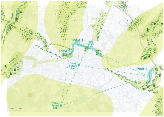 The majority of the TALEA budget, funded by the EUI (EUR 4,999,984.32) is allocated to this phase, in which the co-designed physical transformations will be carried out in three significant areas of the city. These areas represent the project pilot sites that will host the TGCs as grafts and trigger elements of change. They were selected for their overall fragility and potentiality, assessed overlapping different thematic levels, including climate fragility, socio-demographics, urban ecological networks, and the incorporation of citizens’ proposals through the Bologna Participatory Budgeting process [60,61].