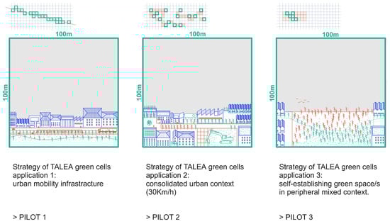 A TGC is a compact and highly adaptable spatial unit that serves as connective tissue in both the physical and digital realms. It is a customizable, adaptable, and combinable physical element that represents TALEA’s minimum intervention site. A TGC has a size of 100 × 100 metres; this dimension was determined based on the monitoring possibilities of urban microclimate sensors, represents a significant spatial surround, if taken alone, and it is a module that can be multiplied in case of pursuing larger-scale impacts (see Figure 3). A TGC alone, multiplied or in combination with others, grafts itself in the existing urban tissue and contributes to the mending and enhancement of GI and green corridors and to the beauty, sustainability, accessibility, and liveability of critical urban spaces, according to the New European Bauhaus policy and funding initiative (https://new-european-bauhaus.europa.eu/index_en, accessed on 20 December 2024). Reconnective areas can be configurated by juxtaposing TGCs of the same type, used as basic modules to be adapted in number to the specific needs of the area, or TGCs of different types can be mixed and integrated, depending on their purpose, on the type of green to be reconnected, and on the expected interactions with other systems/infrastructures (mobility, buildings, water system, utility networks, etc.). Their integration into an existing green system, with critical disconnecting elements, allows for the foreshadowing of viable alternative scenarios and ex ante assessment of their impacts on the system as a whole [45,46].