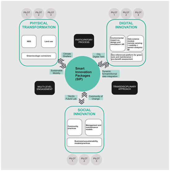 An important characterization of the TALEA project is the context in which it applies its research–action approach. As stated in the introduction, cities are at the forefront of multiple interlinked crises, from climate change to social inequalities. In this context, the UHI and UHW effects disproportionately affect vulnerable communities, particularly in Mediterranean cities like Bologna. The challenge is even more critical in historically dense and consolidated urban fabrics, where limited open spaces, high building density, and the predominance of impermeable surfaces intensify heat accumulation and make conventional greening strategies more difficult to implement. TALEA has chosen to act in this urban context. Unlike newly planned urban areas, where large-scale green infrastructure interventions can be more easily integrated, historic city centers require adaptive, small-scale, and multifunctional solutions that can be embedded within the existing built environment while ensuring social inclusivity and urban resilience. TALEA aims to address these challenges through its innovative, cross-disciplinary approach that blends nature-based solutions, digital innovation, and participatory governance, and it also aims to test its transferability to enable cities to effectively mitigate climate risks while preserving their cultural and architectural heritage.
