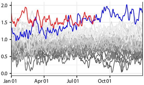 Surface air temperature of years 2000–2020 (darker gray) vs. 2023 (blue line) and 2024 (red line) [1].