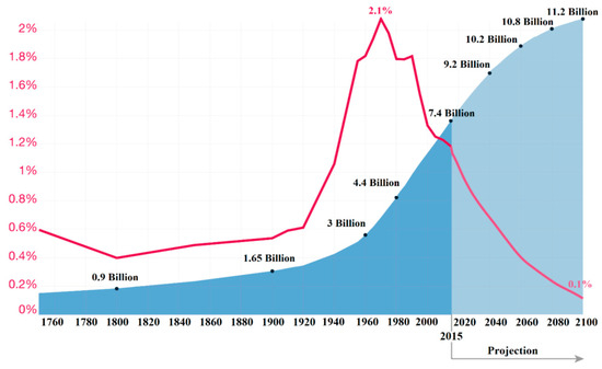 Growth rate (red line), world population between 1760–2015, and world population projection [3,4].