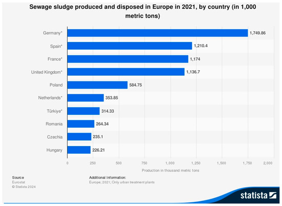 - Available online: https://www.statista.com/statistics/1393771/sewage-sludge-generation-europe/ (accessed on 24 January 2025).