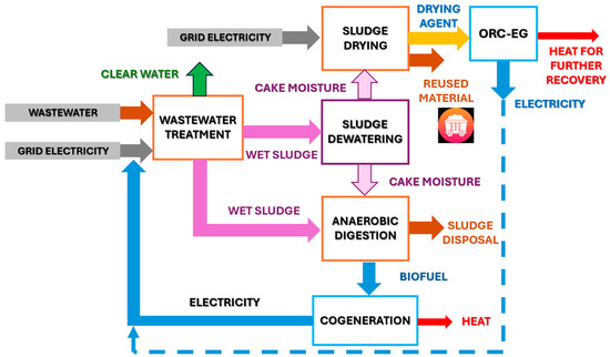 Wastewater treatment plants traditionally dispose of sludge using the method of landfilling and incineration, with both being carbon-intensive and environmentally harmful. Converting sludge into energy or reusable materials avoids landfills or incineration, helping reduce the volume of waste and associated pollution. Sludge treatment with energy recovery can offset fossil fuel use, further reducing the carbon footprint of sewage treatment processes. This research explores ways to recover energy from sewage sludge, a byproduct of wastewater treatment that is often considered waste. Transforming sludge into valuable resources aligns with the principles of the circular economy, where waste streams are repurposed, minimizing environmental impact and enhancing resource efficiency. In this paper, a method is presented to reduce the volume of wastewater sludge by drying it in a hot flue gas stream at 700 °C. The energy of the exhaust gas is recovered in an organic Rankine cycle system, which powers the wastewater treatment facilities themselves, making them more self-sustaining.