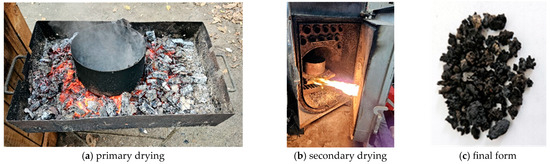 It was then subjected to a two-stage dehydration and thermal-drying process. In the first stage, the primary moisture was removed by exposing the contents to a unidirectional thermal radiant flow in an open external environment (Figure 7a). At intervals, the mixture was homogenized using a spatula.