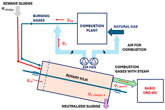The sewage sludge neutralization system is derived from wastewater treatment processes. For the solution proposed in this research (Figure 8), the drying occurs within a rotary kiln, which is supplied with combustion gases. At the kiln’s inlet, gas temperatures range between 700 °C and 750 °C, facilitating the release of volatile matter and the ignition of combustible components.