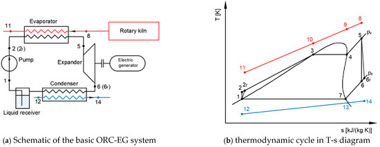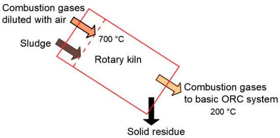 At the rotary kiln’s exit, the combustion gases, containing water vapor, reach a temperature of 200 °C, enabling the integration of a basic ORC-EG system (organic Rankine cycle coupled with an electric generator) that will be presented in Section 2.4.