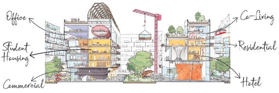 Within the building development sector, architecture and design are increasingly embracing multifunctionality as a response to the challenges of globalization, urban migration, and evolving work-life dynamics. This shift promotes the integration of diverse uses within a single structure, fostering adaptability and long-term sustainability. By accommodating layered functionality—such as retail, cultural spaces, hospitality (e.g., cafés, restaurants, hotels), co-living, and co-working—buildings can remain relevant and economically viable despite shifting societal needs, as shown in Figure 1.