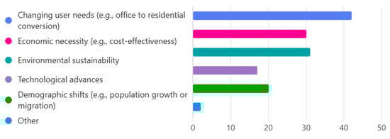 First, the representativeness of the sample remains a constraint. Although this study gathered responses from industry professionals and end-users, these perspectives may not fully capture the diversity of urban populations or stakeholders involved in large-scale redevelopment projects. Additionally, regional constraints must be considered. As this study primarily focuses on specific urban contexts, its findings may not be directly transferable to cities with different regulatory frameworks, economic structures, or cultural attitudes toward adaptive reuse.