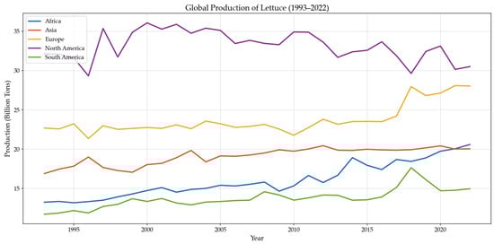 Global production of lettuce from 1993 to 2022. (Data source: FAO dataset, last accessed on 12 March 2025).