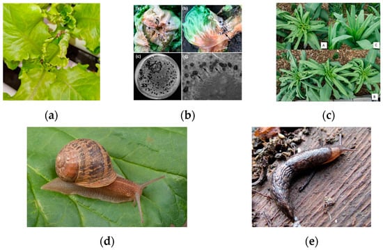 Samples of lettuce disease and pest: (a) a sample of lettuce tip-burn stress [54]; (b) samples of sclerotinia drop (sclerotinia rot) [55]; (c) samples of lettuce leaf curl disease [56]; (d) a sample of European brown snail [57]; (e) a sample of gray garden slug [57].