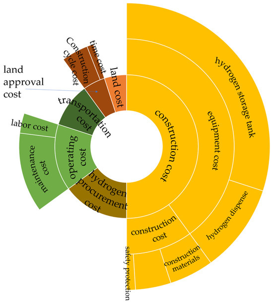 In site selection, it the mention of various construction costs is unavoidable. The study on the location of shared bicycles in urban environments found that the travel demand of users was affected by land use, which resulted in different operating costs [41]. The goal of the site selection of green logistics parks is to minimize transportation and environmental costs to reduce the total cost of site selection [42]. For the emergency location problem, transport, deployment, inventory, and safety inventory costs can be considered in the model to analyze the site location when the total emergency logistics cost is lowest [43]. In the siting study of oil–hydrogen combined stations, different siting situations were discussed to minimize construction costs, transportation costs, and carbon emissions [15]. The entire life cycle cost of hydrogen energy, including hydrogen production, transportation, storage, use, and carbon tax, can be considered in the location of HRS construction costs [44]. In many studies, only some took the total chain cost of station construction in the site-selection model.