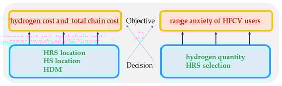 This study assumed that the investment and operation of HRS is a public service project. Therefore, the site selection and construction of HRS’s need to consider not only the investment and operating costs but also the HS, HDM, and the range anxiety of users. There will be some conflicts of interest between HRS investors and HFCV users in the planning process. Therefore, the HRS network optimization involves two subjects: HRS investors and HFCV users. The decisions of the two types of subjects will affect and function on each other so that it can be considered as a bi-level programming problem (see Figure 2).