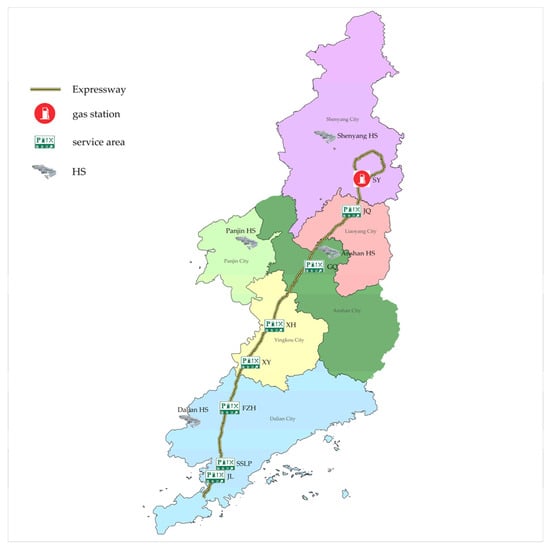 The site selection of HRS was studied by taking the Shenyang–Dalian Expressway in Liaoning Province as an example. The reason for choosing this path is that Liaoning Province is actively building a “hydrogen corridor”. The province has introduced various hydrogen subsidy policies that promote hydrogen equipment and the construction of HRSs. High costs, such as the construction cost of HRSs, can be addressed with adequate policy support [48,49]. Along the Shenyang–Dalian Expressway, residential areas and factories are evenly distributed and densely clustered, making it unsuitable to develop new sites for HRSs. Constructing a standalone HRS involves complex processes such as land approval and safety reviews. Combined stations not only streamline these cumbersome procedures but also enhance operational efficiency. Therefore, this study selected all of the service area and gas station along the Shenyang–Dalian Expressway as a candidate site for HRSs [50].