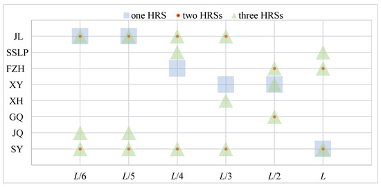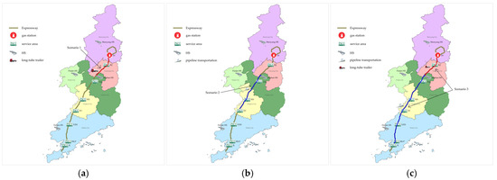 Three scenarios are set according to the different values of the HRS site selection expense—T = 1.2 × 107 (CNY), T = 1.2 × 107 (CNY), T = 2.4 × 107 (CNY)—and the initial remaining range— (km), (km), (km). HFCVs returning to the city must meet the maximum remaining range to cover the distance from JL to Dalian. The selection results of HRSs, HSs, and HDMs are shown in Figure 4.