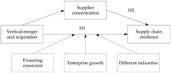 Vertical M&A refers to M&A between upstream and downstream distributors within an integrated supply chain. Existing literature predominantly investigates the driving factors and economic consequences of vertical M&As. Regarding the driving factors of vertical M&As, current academic circles suggest that the primary driving factors include institutional environment and industry characteristics. In terms of the institutional environment, Fan et al. (2017) argued that enterprises influenced by the industrial policy of becoming bigger and stronger will carry out more M&As [12], and the uncertainty of external economic policies and the instability of price fluctuations will increase enterprises’ transaction costs, thereby forcing them to conduct vertical M&As [13,14]. Institutional factors, such as accelerating financial deepening and improving trade liberalization, promote vertical M&As by reducing factor flow barriers [15,16]. At the industry level, the visibility of supply chain risks prompts enterprises to establish risk defense mechanisms through vertical M&As [17]. The degree of asset specificity positively influences firms’ propensity for vertical M&As, and the sunk costs resulting from specific investments drive firms to implement vertical M&As [18]. State-owned enterprises, leveraging their resource acquisition advantages and facing policy-oriented constraints, are more inclined to achieve industrial chain reconstruction through vertical M&As [19].