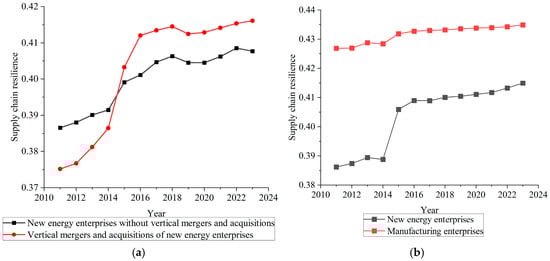 To empirically investigate the supply chain resilience of renewable energy enterprises, an analysis will be conducted to determine whether vertical M&As have occurred, as well as to compare the supply chain resilience of different types of enterprises. The specific findings are presented in Figure 2. From Figure 2a, it can be observed that the supply chain resilience trend of renewable energy enterprises that have not undergone vertical M&A remains relatively stable, while the supply chain resilience trend of renewable energy enterprises that have undergone vertical M&A shows continuous improvement. During 2011–2014, a few renewable energy enterprises engaged in vertical M&As. During this period, the supply chain resilience of renewable energy enterprises that underwent vertical M&A was lower than that of those that did not undergo vertical M&A. The possible reasons are that renewable energy enterprises are currently in their growth stage. Due to their high technology and high investment characteristics, financial institutions impose stricter approval conditions for bank loans, and the government’s subsidy and tax incentive systems have not yet been fully developed. In this situation, enterprises often face funding shortages. If vertical M&As are carried out, substantial cash outflows may occur, potentially leading to cash flow shortages for the enterprises. This could result in the enterprises being unable to meet their normal production supply and demand, thereby affecting the stability of the supply chain and leading to weaker supply chain resilience. In 2015, a large number of renewable energy enterprises underwent vertical M&A, and their supply chain resilience significantly increased, exceeding that of renewable energy enterprises that did not undergo vertical M&A. Subsequently, supply chain resilience showed a steady upward trend. The reason for this is that, under the guidance of industrial policies such as expanding and extending the industrial chain, more and more renewable energy enterprises are conducting vertical M&A to maintain their competitive advantage and enhance the resilience of their supply chains. From Figure 2b, it can be observed that the average supply chain resilience of renewable energy enterprises is 0.400, compared to 0.432 for manufacturing enterprises. Although the supply chain resilience of renewable energy enterprises continues to improve, it remains weaker than that of manufacturing enterprises. By describing the basic characteristics of supply chain resilience in renewable energy enterprises, it can be concluded that vertical M&As serve as a crucial mechanism for enhancing the resilience of renewable energy supply chains. Strengthening the resilience of renewable energy enterprise supply chains is particularly important for achieving their high-quality development.