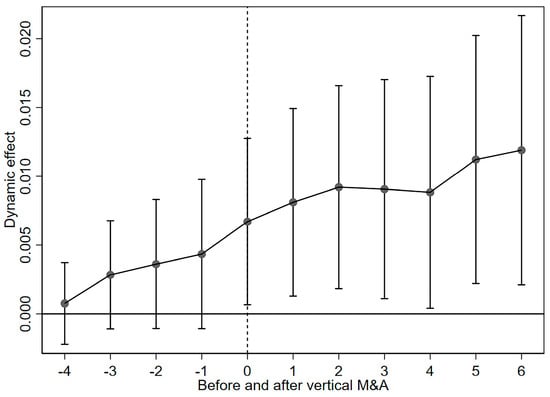 The validity of the DID estimation relies on the parallel trends assumption: Prior to renewable energy enterprises’ vertical M&A events [55], the supply chain resilience trends between the treatment group and the control group must be statistically indistinguishable. To empirically validate this, a regression model should be established that examines the supply chain resilience and time dummy variables of renewable energy enterprises. The results of the parallel trend test are shown in Figure 3. There was no significant difference in supply chain resilience between the treatment group and the control group samples before the vertical M&A; however, after the vertical M&A, the regression coefficient began to be positive and passed the significance test, thus satisfying the parallel trends hypothesis.