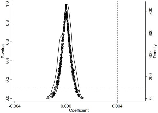 To strengthen the causal interpretation that vertical M&A enhances supply chain resilience in renewable energy enterprises, a placebo test was randomly selected from both treatment and control groups [56]. Specifically, 178 renewable energy enterprises were randomly selected from the full sample to serve as the false experimental group, while the remaining enterprises were designated as the false control group. False vertical merger dummy variables were randomly generated for the experimental group samples, and the estimated coefficients of their impact on supply chain resilience were obtained through regression analysis. This random sampling process was repeated 500 times, and the p-values and kernel density distributions of the 500 estimated coefficients were plotted, as illustrated in Figure 4. The results reveal that the estimated coefficients of Vma are centrally distributed around 0, and the corresponding p-values for most coefficients are greater than 0.1. The estimated coefficient of 0.004 obtained in the benchmark regression represents a rare occurrence in the random matching experiment. These findings indicate that the promotion effect of vertical mergers and acquisitions on supply chain resilience in renewable energy enterprises is not significantly influenced by unobservable factors.