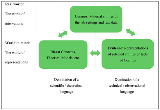 The second model, Cosmos–Evidence–Ideas (CEI), presented in Figure 2, is based on Hacking’s [51] classification of laboratory practice entities. Hacking’s classification refers to the laboratory sciences that “construct” part of the material world in the laboratory in order to study it [51]. The use of the CEI framework in educational settings [52,53] has the advantage of allowing a fruitful analysis of teaching–learning activities in terms of scientific practice; it does not, however, imply that the variety of possible patterns is precisely similar for students and scientists. According to Hacking [51], scientific activity is characterized by an almost autonomous “inner life”, which has an internal dynamic that is hardly disturbed by external factors such as social or cultural relationships. The entities that are part of this inner life interact with each other and are constantly transformed as a result of this interaction. They are grouped into three categories: Ideas, Cosmos, and Evidence. Ideas refers to theoretical concepts, beliefs, questions, fundamental knowledge, theoretical models, and systematic theories, all related to the natural phenomenon being studied. They are linguistic entities whose aim is to represent the physical phenomena to which they refer. The Cosmos entity includes the sample, data generators, devices that interact with the sample, and raw data such as change graphs, photos, etc. All of the above give substance to the phenomenon in the real world, to which the scientist himself belongs. Sometimes, the presentation of the content of the material world can only be done in language, for example, when a teaching activity is described. The Cosmos concept does not contain a conceptual content by itself; this is provided by language when we interact with this entity. For this reason, the terms used in these descriptions are as neutral as possible so that they are understood to correspond to entities that in themselves have no conceptual load. They will acquire specific content (Idea or Evidence) only after appropriate manipulation by students. Evidence comprises data that have undergone some form of processing (e.g., estimation, reduction, analysis, or interpretation). It also includes linguistic entities, just like the entity of Ideas, that aim to represent the laboratory phenomenon.