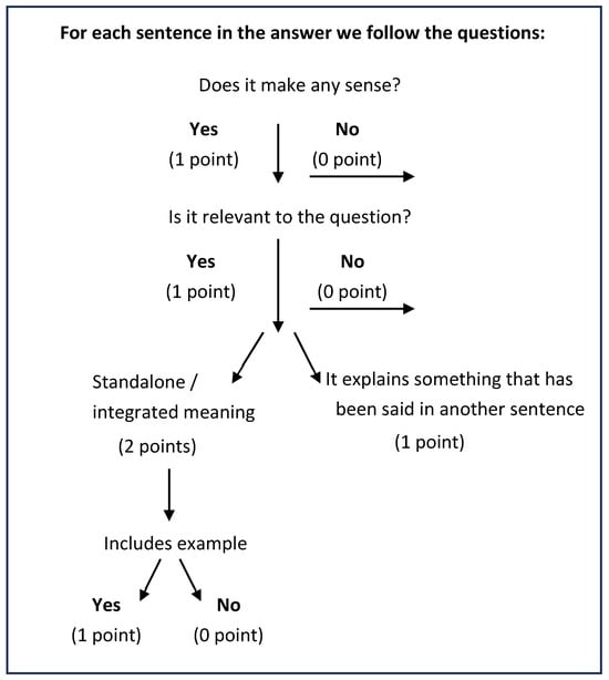 The specific answer includes three proposals—analysis units—each of which was evaluated separately. Each sentence has meaning (1 point), is related to the question (+1 point), and its meaning is autonomous and comprehensive (+2 points). Therefore, each proposal was rated with 4 points, and the total score of the answer is the sum of them, i.e., 12.