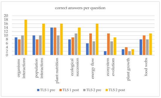 In addition to the quantitative, qualitative differences were also identified in the responses to the MCs in the two groups. The coding as “true or false” of students’ responses was used to track their cognitive development in relation to specific ideas included in the instruction. Figure 6 provides an overview of the concepts whose understanding seemed to be enhanced for students in each group since it depicts the change in the number of correct answers per question. It appears that the students in the TLS 1 group increased the correct answers to the questions concerning the energy flow and the evolution of an ecosystem, while the TLS 2 students chose the correct answer more frequently for all questions after instruction. The largest increase was observed for questions concerning the interactions of organisms and populations as well as the flow of energy.