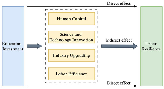 Education, as one of the important influences on productivity, has a subtle driving effect on urban resilience. From the perspective of the practical process of urban resilience construction, the ability to cope with crises and adaptive capacity, and the ability of sustainable development are inseparable from the support of education investment. As a basic public service for urban development, education investment directly promotes the formation of a benign development pattern of human capital quality, production factor allocation, scientific and technological innovation, and social collaboration in cities. On the one hand, education investment cultivates high-quality human capital, enhances the adaptability and learning ability of the public, and strengthens the public’s sense of social participation in a subtle way, so as to cope with crisis impacts through social cooperation, human resource allocation adjustment, and other ways to quickly adapt to the needs of urban transformation, thus enhancing the stability of urban resilience [44,45]. On the other hand, education investment provides innovative technological solutions for crisis management and sustainable transformation by promoting scientific and technological innovation, laying a long-term foundation for sustainable resilience enhancement [46,47], successful experiences from countries such as Singapore, Japan, and the Netherlands also verify this. This paper proposes Hypothesis 1.
