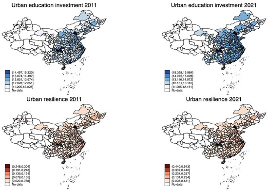 In addition, this paper uses ArcGIS to map the trends in urban resilience and education investment, and the results are shown in Figure 2. First, both urban resilience and education investment in 2021 show a significant increase compared to 2011; this improvement is more significant in the eastern coastal region. At the same time, the results also confirm the significant differences in resilience and education investment between cities in descriptive statistics: cities with higher resilience levels and larger education investment are generally concentrated in the eastern and southern regions, while cities in the western and northern regions lag behind in resilience levels and education investment. The above results reflect the dynamic changes of urban resilience and education investment; on the one hand, the synchronous change of the two proves the correlation between urban resilience and education investment. On the other hand, the basic facts of urban resilience and education investment also have obvious differentiation, which together provide a good realistic situation for this paper to explore the relationship between education investment on the impact of urban resilience.