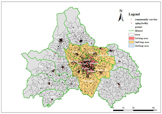 Overall, 55,645 LTSS recipients and 194 facilities were included in this study. Among all 55,645 recipients, only 34,691 were reimbursed by LTCI, and 20,954 had not yet been reimbursed by the end of 2021. Among the 194 facilities, 105 provide residential care, and 114 provide home care, with 25 institutions offering both types of services. They collectively provide 11,567 LTSS beds and 1,581 formal caregivers. The addresses of LTSS recipients and facilities were collected from the CDHSA database (restricted to the community level for privacy protection) by the end of 2021. We have re-verified the accuracy of the addresses through Baidu Map. A total of 350 recipients were excluded because of unidentified addresses, and three facilities were excluded because they were marked “inactive to provide services” by the map service. These addresses were converted into points of interest (POIs) using Amap’s Web API service and mapped using ArcGIS 10.2. Figure 1 illustrates the spatial distribution of functional areas (three-loops) and POIs in Chengdu.