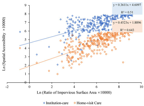 We first delved into the relationship between the spatial accessibility of LTSS and the prevailing levels of urbanization. In similar studies, impervious surfaces were crucial indicators of urbanization [52,53]. Drawing upon the “30 Meters Annual Land Cover Dataset” [54], we employed the ratio of impervious surface area to the total land area, based on 2022 data, as a robust metric to gauge the level of urbanization across various townships and streets. This spatial distribution is congruent with the “three-loops” of the functional areas, as illustrated in Figure 1. We examined the relationship between spatial accessibility and the impervious surface area ratio using a linear regression model. The results showed a robust positive link between spatial accessibility for LTSS and urbanization level (Figure 2). Spatial accessibility, as gauged by either institutional or home care, consistently exhibited a positive correlation with the ratio of the impervious surface area. The corresponding R2 values are 0.513 and 0.643, respectively.
