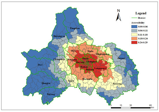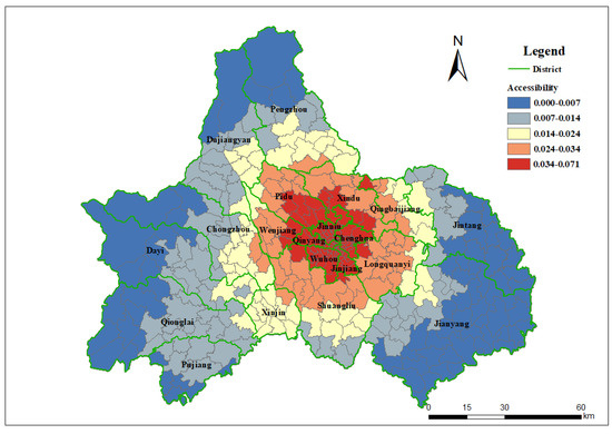As shown in Figure 3, the spatial distribution (including nursing homes and hospitals) was significantly polarized and consistent with the functional areas of Chengdu. The coefficient of variation, obtained by dividing the standard deviation by the average, was 0.6264, which is a prominent level. Spatial accessibility is relatively high in the city center, benefiting from the clustered older adult population and healthcare facilities. With increasing distance from the centroid of the downtown area, spatial accessibility gradually decreased. Compared with Chengdu’s functional area, the areas with higher spatial accessibility extend beyond the “first loop” and cover some communities of the “second loop”, with the highest accessibility in the Longquanyi district.