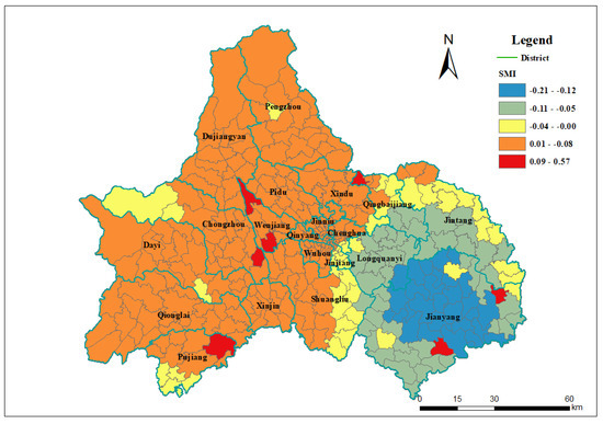 The absolute value of the spatial mismatch index (SMI) reflects the spatial dislocation intensity between the accessibility of home care and institutional care in various towns and villages. The larger the absolute value, the more significant the spatial mismatch. A positive SMI indicated that the accessibility of home care was better than that of institutional care, whereas a negative SMI indicated that the accessibility of home care was worse than that of institutional care in towns and villages.