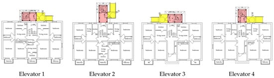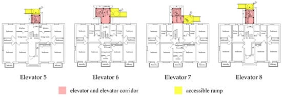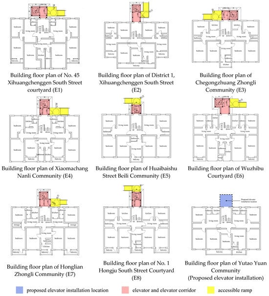 Field investigations across over 30 communities in Beijing’s Dongcheng, Xicheng, and Haidian districts either retrofitted with elevators or that are planning retrofits revealed multiple elevator model options available for identical building types. Taking Xicheng District as an example, the “Beijing Technical Guidelines for Elevator Retrofitting” (hereafter “Guidelines”) [8] issued in 2020 specify 13 commonly used elevator models (abbreviated as “Elevator n”). The elevator configurations were categorized into two types based on stopping positions: semi-level stop and level-level stop. Furthermore, the semi-level stop elevators were subdivided into eight types (Figure 1), while the level-level stop elevators were classified into five types, with classifications determined by factors including elevator shaft location, connecting corridor length, entrance door and accessible ramp positions, as well as window dimensions and placement. However, no standardized criteria exist for selecting optimal elevator types based on specific building characteristics. This ambiguity has led to issues such as excessive costs, spatial inefficiency, and reduced living quality when inappropriate models are chosen, subsequently dampening community enthusiasm for retrofits and slowing overall progress.
