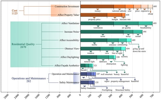 Based on the conclusions from the literature review, this study filtered and integrated web data. In September 2024, 982 trending topics and 14,232 comments under the keyword “elevator retrofitting in existing residential buildings” were collected from Google, Baidu, Xiaohongshu, Bilibili, and Weibo. After removing irrelevant information and merging semantically similar entries, factors influencing living quality post-retrofitting were identified from public concerns (Figure 3).