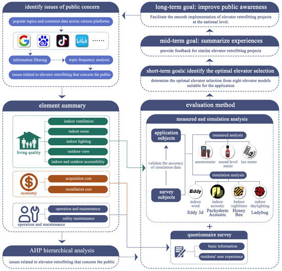 As a critical issue concerning people’s livelihood, domestic theoretical research on elevator retrofitting primarily focuses on installation procedures, negotiation methods, and optimization of supportive policies [10,11,12]. Practical studies in China mainly concentrate on summarizing the common patterns of residential elevator additions, proposing design rules for overall planning, architectural design, structural design, and electromechanical equipment [13,14,15]. Developed countries such as those in Europe and America have earlier adopted systematic evaluation methods in existing building retrofits. For instance, some U.S. states enforce elevator installations in multi-story residential buildings through the “Accessibility Design Standards” (ADA) and optimize solutions based on user satisfaction surveys (e.g., noise and privacy perception) [16]. Germany employs energy consumption simulations and life cycle cost analysis (LCCA) to select elevator models yet often overlooks residential quality and comfort indicators [17]. Japan introduced the “Universal Design” concept in aging community renovations, emphasizing the seamless integration of elevators with building forms, but its evaluation system prioritizes technical compliance over residents’ subjective experiences [18]. In summary, current research both domestically and internationally often segregates objective and subjective indicators, lacking a comprehensive evaluation framework that precisely aligns with residents’ living quality and in-depth qualitative and quantitative analyses of retrofitting details. This reliance on subjective preferences alone fails to comprehensively and effectively address public concerns. Therefore, it is essential to focus on currently implemented residential elevator retrofitting projects, integrating the scientific analysis of objective data with subjective questionnaires, to develop a more objective and multidimensional comprehensive selection method for existing residential elevator retrofits.
