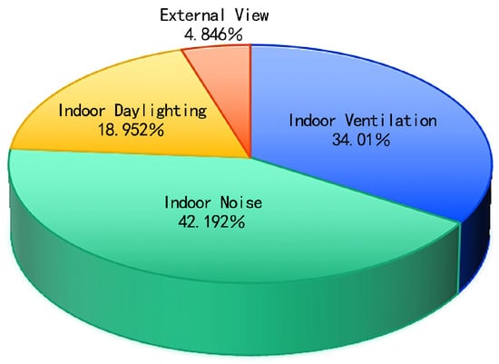 Based on the literature review and crawled web data, this study established an evaluation framework comprising four factors: indoor ventilation, indoor noise, indoor daylighting, and external visual access (Figure 4). The specific evaluation process was as follows: