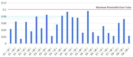 First, a measured analysis was conducted for each survey subject using the SMART SENSOR-AM824 sound level meter (Manufacturer: Smart Sensor, City: Dongguan, Country: China) to measure indoor sound pressure levels. The arrangement of measurement points for indoor acoustic environments and the methods for data validity verification were consistent with those for indoor wind environments [57,58]. Multiple measurements were taken to reduce errors caused by the sound level meter’s precision limitations (SMART SENSOR-AM824 with a nominal error of ±1.5 dB) and incomplete isolation of background noise. This was achieved by controlling the deviation between maximum and minimum values and calculating the mean. For indoor acoustic environment simulations, Pachyderm Acoustic v2.6.0.5 was employed. This software includes a built-in elevator room frequency spectrum library and allows the customization of sound power level curves, offering advantages over generic acoustic software (e.g., Odeon) that uses simplified point source models. The primary noise sources in the simulation were the elevator room and elevator car noise sources provided by Pachyderm Acoustic. By comparing simulation results with measured data and balancing accuracy and computational speed, the final simulation parameters were determined as follows: acoustic properties of building materials were set for typical multi-story residential buildings, the iteration count was set to 800, and the noise measurement plane was positioned 1.5 m above the indoor floor level [59,60,61,62]. Under these settings, the maximum error was 4.459 dB for E3-6F, which was less than 10% of the measured value (Figure 10), indicating high reliability of the simulation data [21,44].