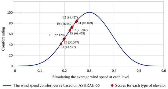 After obtaining the simulation parameters, the experimental subject was analyzed (Figure 8) and the results were scored using the PMV (predicted mean vote) method according to the ASHRAE 55–2017 standard [56] (Figure 9). The calculation method is shown in Equation (1), where the indoor wind comfort rating (dimensionless) ranges from 0 to 100, with higher values indicating better indoor wind comfort; v represents the indoor wind speed (m/s) and k is the steepness coefficient of the Gaussian correction term (dimensionless), controlling the decay rate of ratings in high wind speed areas (based on an air temperature of 22 °C, relative humidity of 50%, metabolic rate of 70 W/m2, and clothing insulation of 1.0 clo; k = 5 was derived from the ASHRAE 55–2017 standard table.