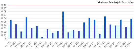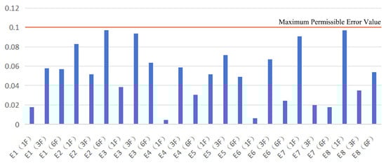 Indoor daylighting measurements were conducted using the SMART SENSOR-AS823 illuminance meter (Manufacturer: Smart Sensor, City: Shenzhen, Country: China) to measure indoor illuminance levels. The arrangement of measurement points for indoor daylighting, data validity verification, and methods were consistent with those for indoor ventilation. For indoor daylighting simulations, the Daylight Simulation plugin in Ladybug was employed, utilizing meteorological data for Beijing in 2023 from the Energy Plus website (epw format). Multiple measurements were taken to reduce errors caused by the illuminance meter’s precision limitations (SMART SENSOR-AS823 with a nominal error of ±5%) by controlling the deviation between maximum and minimum values and calculating the mean. By comparing simulation results with measured data and balancing accuracy and computational speed, the final simulation parameters were determined as follows: the acoustic properties of building materials were set for typical multi-story residential buildings, the building grid refinement level was set to 3, the iteration count was set to 700, and the daylighting measurement plane was positioned 1.5 m above the indoor floor level. Under these settings, the maximum error was 4.734% for E4-3F, which was less than 10% of the measured value (Figure 13), indicating high reliability of the simulation data [64,65,66].