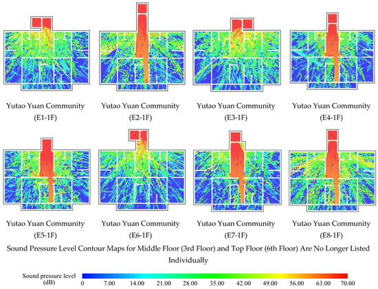 A comparison was made between the elevator types with the highest and lowest indoor noise scores. For E6, the elevator shaft was detached from the building, and the elevator entrance door was not directly opposite the staircase. The connecting corridor length was 1.8 m, aligning with the noise-reducing layout described above. The average simulated sound pressure level across all floors was 36.663 dB, indicating the minimal impact of elevator noise on the residential interior. In contrast, E5 had an elevator shaft attached to the building, with the entrance door directly opposite the staircase and no connecting corridor. The average simulated sound pressure level across all floors was 51.172 dB, representing the greatest impact of elevator noise on the residential interior. To minimize the impact of elevator installation on indoor acoustic environments, the following measures are recommended: