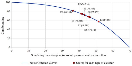 The final indoor noise evaluation scores were as follows: Elevator Type 6 (90.091) > Elevator Type 2 (86.338) > Elevator Type 1 (80.717) > Elevator Type 3 (78.292) > Elevator Type 7 (72.241) > Elevator Type 8 (70.426) > Elevator Type 4 (69.325) > Elevator Type 5 (68.667) (Table 3).