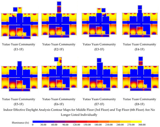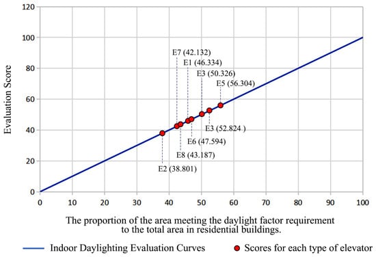 The final indoor daylighting evaluation scores were as follows: Elevator Type 5 (92.760) > Elevator Type 3 (86.836) > Elevator Type 4 (80.643) > Elevator Type 6 (77.318) > Elevator Type 1 (76.823) > Elevator Type 8 (73.177) > Elevator Type 7 (72.890) > Elevator Type 2 (63.990) (Table 4).