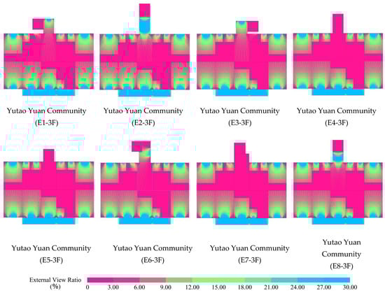 For indoor visual aspects, the outdoor view ratio was adopted as the evaluation metric, defined as the proportion of outdoor landscape visible to occupants through windows or other openings in the building. Since the calculation results are solely influenced by the building and elevator layout, as well as the position and size of windows and doors, and do not involve fluid simulation, the software simulation results directly represented the actual measurements. Therefore, for indoor visual aspects, no comparison or feedback calibration between measured and simulated data was conducted based on survey subjects. Instead, the experimental subjects were directly used for parameter calibration. The View Analysis plugin in Ladybug was employed and, by comparing simulation results with measured data and balancing accuracy and computational speed, the final simulation parameters were determined as follows: view analysis precision was set to level 3, the iteration count was set to 50, and the outdoor view ratio analysis plane was positioned 1.5 m above the indoor floor level.