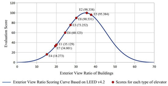 After obtaining the simulation parameters, the experimental subjects were analyzed (Figure 16), and the results were scored according to the LEED v4.1 “Green Building Rating System” [67,68,69] (Figure 17). The calculation method is shown in Equations (4) and (5), where x represents the outdoor view ratio; the numerator is the actual visible outdoor area; the denominator is the theoretical maximum visible area; the Indoor Outdoor View Evaluation Score (dimensionless) ranges from 0 to 100, with higher scores indicating greater occupant comfort regarding outdoor views; and k is the curve steepness coefficient, set to k = 2.5 based on the LEED v4.1 standard.