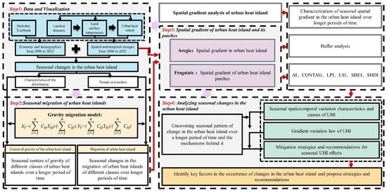 Based on data from the Changsha Statistical Yearbook and the development of the urban economy and population over the past 15 years, this study determined the study period. The land surface temperature was inverted, the urban heat island index was calculated, and the heat island level was classified. Using methods including the transition matrix, gravity migration model, and spatial gradient analysis, this study explores the seasonal spatiotemporal variation traits and migration patterns of the UHI in Changsha City from 2006 to 2022, as well as the spatial gradient of the heat islands and their patches (Figure 2).