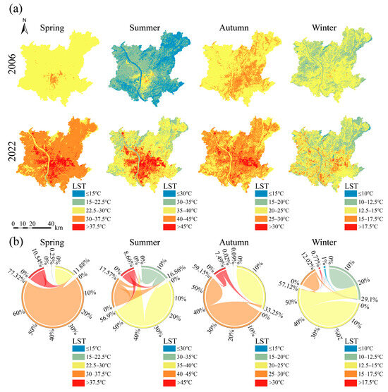 Seasonal variation characteristics of land surface temperature in Changsha City from 2006 to 2022 (a). Seasonal transitions of land surface temperature categories in Changsha City from 2006 to 2022 (b).