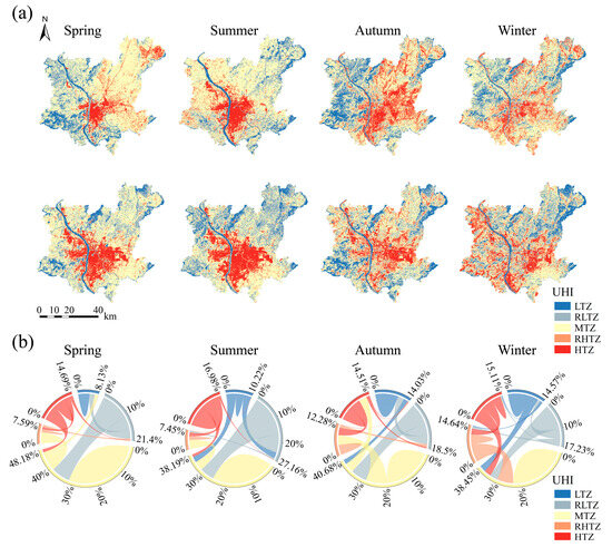 Figure 4b illustrates that from 2006 to 2022, the proportions of high-temperature UHI in spring, summer, autumn, and winter were 22.28%, 24.52%, 26.79%, and 29.75%, respectively, while low-temperature cold islands (LTZ and RLTZ) accounted for 29.53%, 37.38%, 32.53%, and 31.80%, respectively. Furthermore, the area of heat island transformation was largest in winter in Changsha City, at 2309.06 km2, followed by autumn at 2208.52 km2, with the smallest area of transformation in spring at 2050.16 km2. This may be associated with the heat island solidification in spring. The highest proportion of transfers out of high-temperature UHI occurred in autumn, at 38.83%, followed by winter at 31.5%, with the lowest proportion in summer at 17.87%. This suggests a potential phenomenon of heat island degradation in autumn.