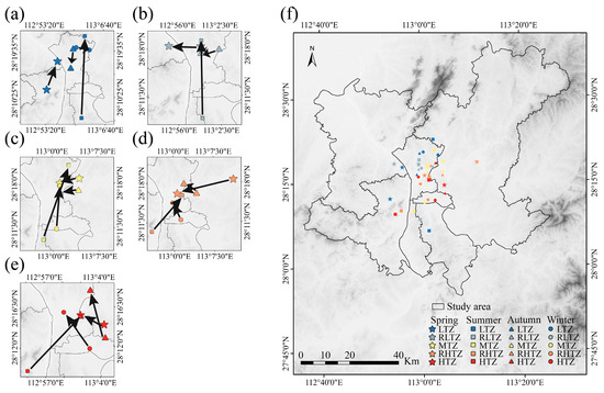 Gravity center migration of different grades of UHI from 2006 to 2022. The arrowhead points to 2022, and the arrowtail faces 2006. A through f represent the gravity center migration of various temperature zones across different seasons from 2006 to 2022: (a) LTZ, (b) RLTZ, (c) MTZ, (d) RHTZ, (e) HTZ, and (f) each grade of UHI.